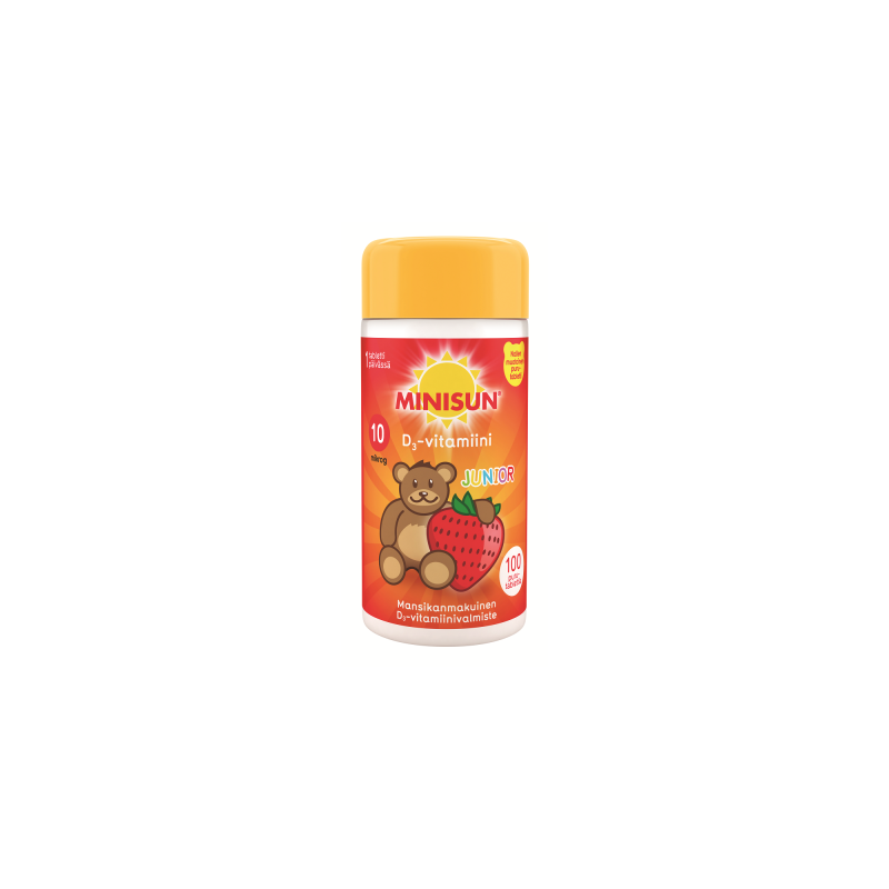 Minisun Junior Nalle on helppo tapa turvata lapsen päivittäinen D-vitamiinin saanti. Minisun Junior Nalle on maukkaan mansikan makuinen ja nallen muotoinen tabletti, joka on helppo pureskella, imeskellä tai niellä. Hyvänmakuiset purutabletit sisältävät 10 mikrogrammaa tehokkaasti imeytyvää D3-vitamiinia. D-vitamiini on tarpeellinen lasten luuston ja hampaiden pysymiselle normaaleina. Lisäksi D-vitamiini edistää immuunijärjestelmän normaalia toimintaa lapsilla. Valmisteessa ei ole lisättyjä väriaineita eikä sokeria. Se ei sisällä gluteenipitoisen viljan ainesosia. Minisun D-vitamiini Junior on lisäksi maidoton, laktoositon, liivatteeton ja hiivaton.