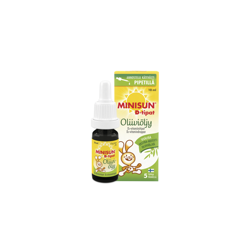 Minisun D-tipat oliiviöljyssä on helppo tapa turvata vauvan D-vitamiinin saanti ympäri vuoden. Yksi Minisun D-tipat oliiviöljytippa sisältää 2 mikrogrammaa D3-vitamiinia. D-vitamiinia tarvitaan lasten luuston ja hampaiden normaaliin kasvuun ja kehitykseen sekä vastustuskyvylle. Tipat on helppo annostella kätevällä pipetillä, ja ne voi sekoittaa ruokaan tai juomaan. Tuote säilyy huoneenlämmössä ja on neutraalin makuinen. Riittoisasta pakkauksesta saa 330 tippaa. Gluteeniton, laktoositon, maidoton ja soijaton.