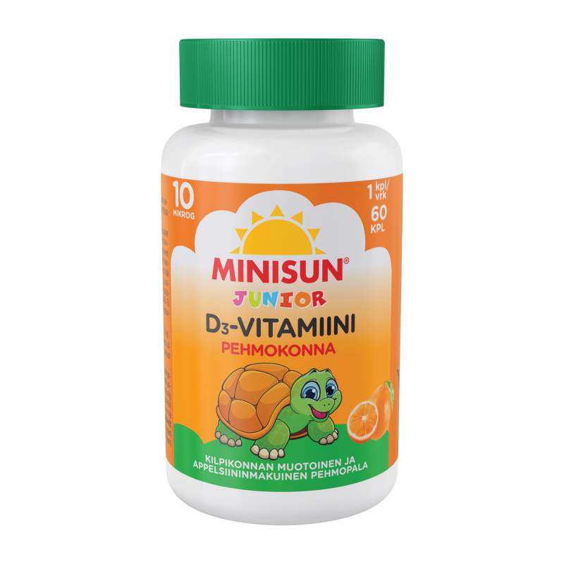 Minisun Pehmokonna D-vitamiini Junior on hyvän makuinen pehmeä ja pureskeltava lasten D3-vitamiinivalmiste päivittäiseen käyttöön. D-vitamiini on tarpeellinen lasten luuston ja hampaiden pysymiselle normaaleina. Lisäksi D-vitamiini edistää immuunijärjestelmän normaalia toimintaa lapsilla. Minisun Pehmokonna sisältää 10 mikrog tehokkaasti imeytyvää D3-vitamiinia, on appelsiinin makuinen ja kilpikonnanmuotoinen. Se on makeutettu hammasystävällisellä maltitolilla ja sen värit sekä aromit ovat luontaisia. Hyytelöimisaineena on liivate (naudasta). Maidoton, laktoositon, soijaton, hiivaton ja sokeriton. Ei sisällä gluteenipitoisen viljan ainesosia.