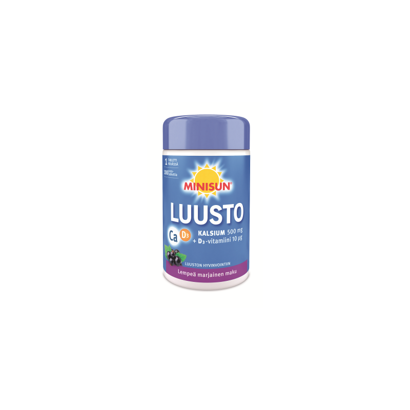 Minisun Luusto Kalsium + D3 sisältää kalsiumia ja D3-vitamiinia luuston hyvinvointiin. Kalsium on tärkeä luuston vahvistaja, jonka imeytymiseen tarvitaan D-vitamiinia. Lisäksi D-vitamiini vahvistaa vastustuskykyä ja on tärkeä vitamiini lihasten ja hampaiden hyvinvointiin. Minisun Kalsium + D3 -tuotteet maistuvat hyviltä, niissä on sopiva määrä kalsiumia ja hyvin imeytyvää D3-vitamiinia. Tuote on lempeän marjaisen makuinen, sisältää runsaasti kalsiumia (500 milligrammaa) ja 10 mikrogrammaa D3-vitamiinia.