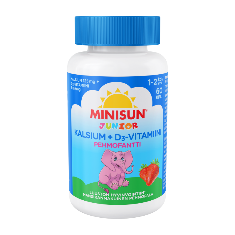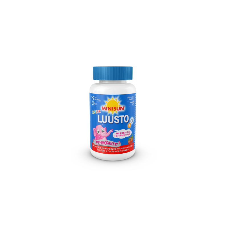 Minisun Luusto Pehmofantti Junior on hyvän makuinen pehmeä ja pureskeltava lasten kalsium- ja D3-vitamiinivalmiste päivittäiseen käyttöön. Kalsium ja D-vitamiini ovat tarpeellisia lasten normaalille kasvulle ja luiden kehittymiselle. Lisäksi D-vitamiini edistää kalsiumin normaalia imeytymistä. Mansikan makuinen ja norsunmuotoinen tuote on makeutettu hammasystävällisellä maltitolilla ja sen värit sekä aromit ovat luontaisia. Tuote sopii Kalsiumin ja D-vitamiinin päivittäisen saannin tukemiseen erityisesti yli 3-vuotiaille lapsille ja nuorille. Minisun Pehmofantti sopii varsinkin lapsille ja nuorille, jotka eivät käytä maitotuotteita. Hyytelöimisaineena on liivate (naudasta). Maidoton, laktoositon, soijaton, hiivaton ja sokeriton. Ei sisällä gluteenipitoisen viljan ainesosia.