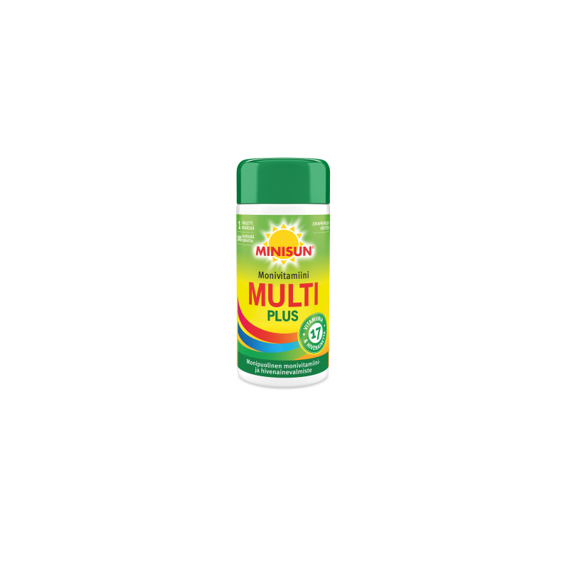 Minisun monivitamiinit ovat helppo tapa turvata päivittäinen vitamiinien ja hivenaineiden saanti ympäri vuoden. Monipuolinen Minisun Monivitamiini Daily on suomalaisille suunniteltu monivitamiinivalmiste, joka sisältää jopa 17 eri vitamiinia ja hivenainetta. Minisun Monivitamiini Daily sisältää erityisesti vastustuskyvylle tärkeitä D- ja C-vitamiinia sekä luuston terveydelle tärkeää kalsiumia. Minisun Monivitamiini Daily on helposti nieltävä tabletti, joka sopii koko perheelle.  1 tabletti päivässä riittää. Tuote on laktoositon, gluteeniton, soijaton, hiivaton ja liivatteeton.