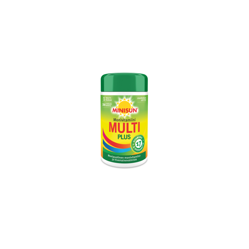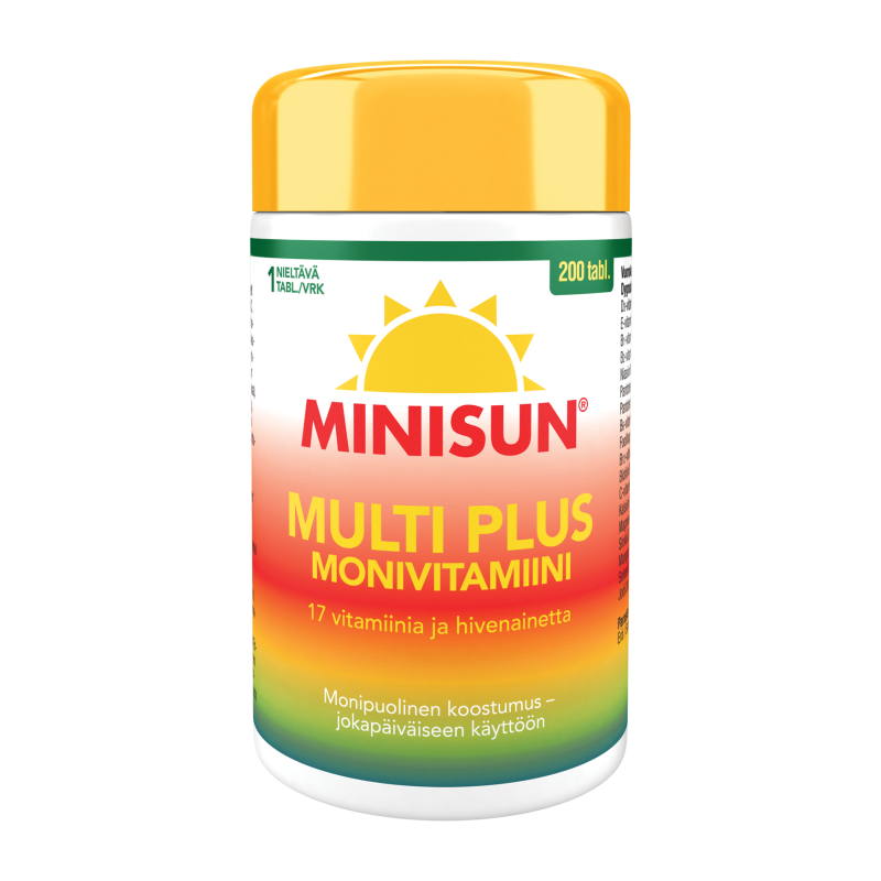 Minisun monivitamiinit ovat helppo tapa turvata päivittäinen vitamiinien ja hivenaineiden saanti ympäri vuoden. Monipuolinen Minisun Monivitamiini Daily on suomalaisille suunniteltu monivitamiinivalmiste, joka sisältää jopa 17 eri vitamiinia ja hivenainetta. Minisun Monivitamiini Daily sisältää erityisesti vastustuskyvylle tärkeitä D- ja C-vitamiinia sekä luuston terveydelle tärkeää kalsiumia. Minisun Monivitamiini Daily on helposti nieltävä tabletti, joka sopii koko perheelle. 1 tabletti päivässä riittää. Tuote on laktoositon, gluteeniton, soijaton, hiivaton ja liivatteeton.
