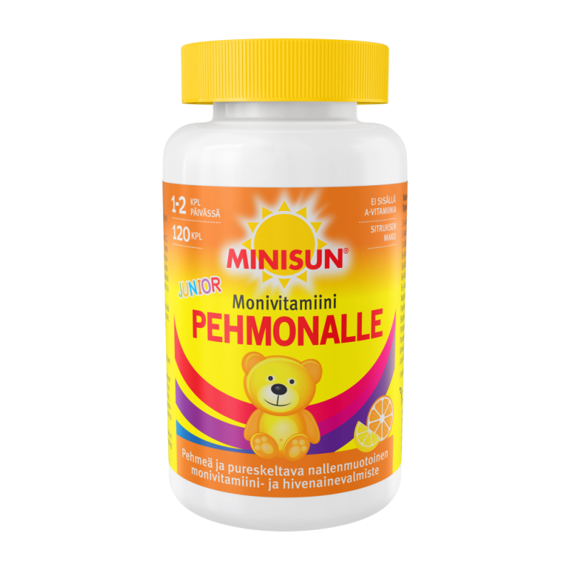 Minisun monivitamiinit ovat helppo tapa varmistaa päivittäinen vitamiinien ja hivenaineiden saanti ympäri vuoden. Minisun Pehmonalle Monivitamiini Junior sitrus on nallen muotoinen, raikkaan sitruksen makuinen, pehmeä ja pureskeltava monivitamiini lapsille. Minisun Pehmonalle Monivitamiini sisältää 13 vitamiinia ja kivennäisainetta. D-vitamiini edistää immuunijärjestelmän normaalia toimintaa lapsilla. Minisun Monivitamiini Pehmonalle Junior ei sisällä A-vitamiinia. Vain luontaiset värit, aromit ja makeutusaineet. Laktoositon, gluteeniton, sokeriton, soijaton, hiivaton ja maidoton.