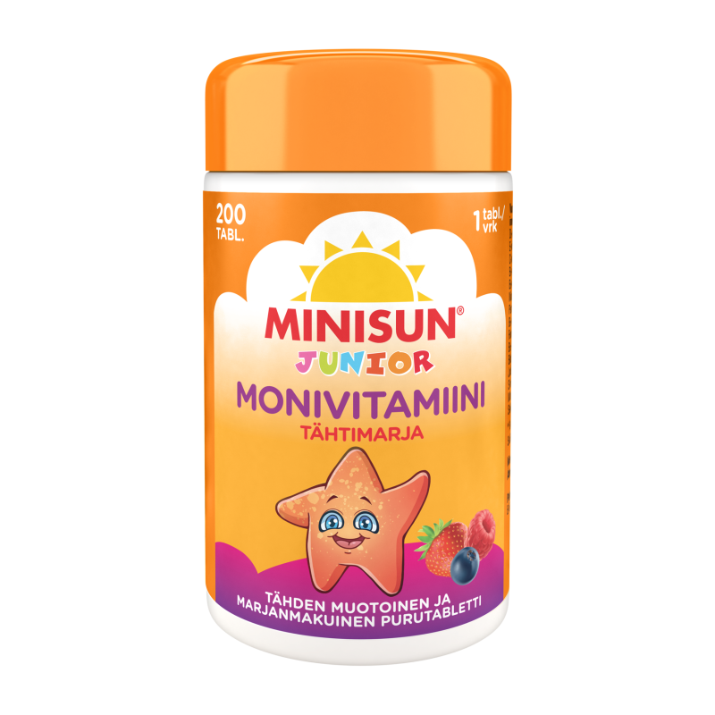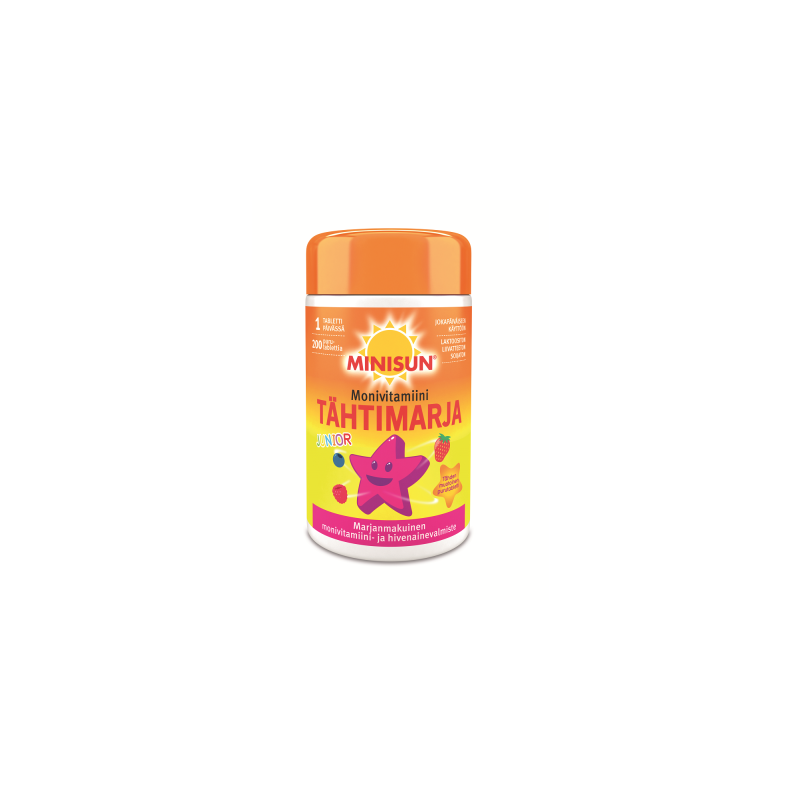 Minisun monivitamiinit ovat helppo tapa turvata vitamiinien ja hivenaineiden saanti ympäri vuoden. Minisun Monivitamiini Junior Tähtimarja on suomalaisille lapsille suunniteltu monivitamiinivalmiste. Se sisältää D-vitamiinia, C-vitamiinia ja sinkkiä. D-vitamiiini edistää immuunijärjestelmän normaalia toimintaa lapsilla. Minisun Monivitamiini Junior Tähtimarja on pienikoinen, tähden muotoinen purutabletti, joka maistuu lempeän marjaiselle. Pieni purutabletti on helppo imeskellä, pureskella tai niellä. Tuote on laktoositon, gluteeniton, maidoton, soijaton , liivatteeton ja hiivaton.
