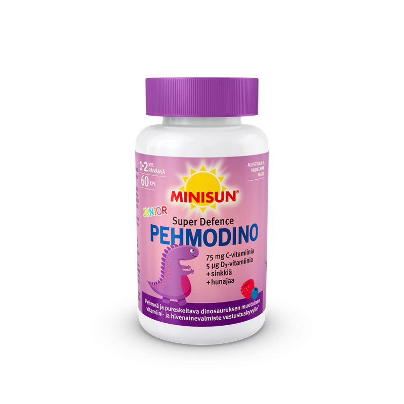 Minisun Pehmodino Super Defence on pureskeltava ravintolisä D3- ja C-vitamiinin sekä sinkin saannin turvaamiseen erityisesti lapsilla. Minisun Pehmodino Super Defence on hyvänmakuinen pehmeä ja pureskeltava lasten vitamiini- ja hivenainevalmiste vastustuskyvylle. Minisun Pehmodino sisältää D3- ja C-vitamiinia, sinkkiä ja hunajaa. D-vitamiini on tarpeellinen lasten luuston ja hampaiden pysymiselle normaaleina. Lisäksi D-vitamiini edistää immuunijärjestelmän normaalia toimintaa lapsilla. Pehmodino on dinosauruksen muotoinen mustikan ja vadelman makuinen pehmeä ja pureskeltava. Tuote sisältää vain luontaisia värejä ja aromeja. Valmiste on maidoton, laktoositon, gluteeniton ja soijaton.