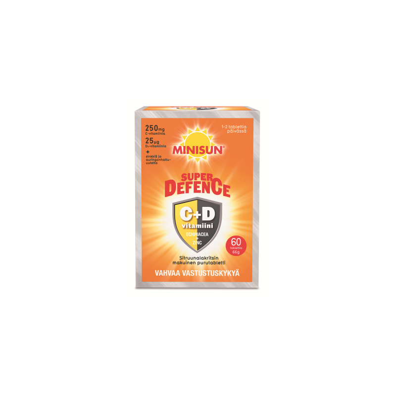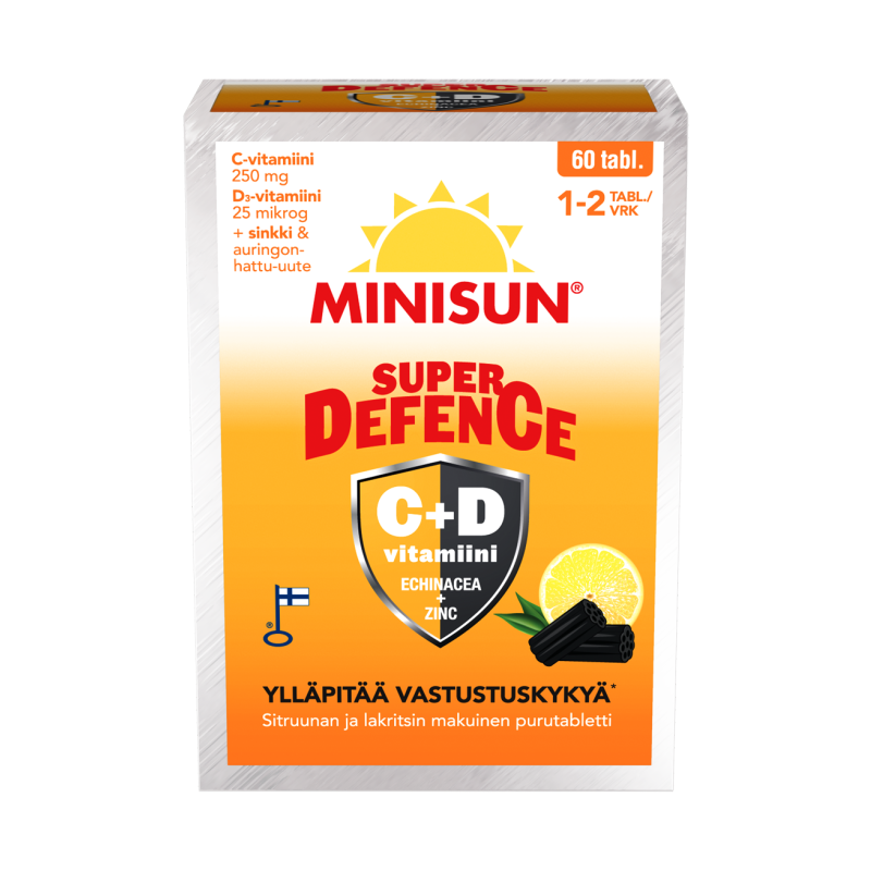Minisun Super Defence on C- ja D3-vitamiineja sekä sinkkiä ja auringonhattu-uutetta sisältävä valmiste. Se sisältää 250 milligrammaa C-vitamiinia ja 25 mikrogrammaa D3-vitamiinia sekä sinkkiä ja auringonhattu-uutetta. Molemmat vitamiinit ylläpitävät tutkitusti vastustuskykyä, ja sinkki sekä auringonhattu-uute edistävät immuunijärjestelmän normaalia toimintaa. Lisäksi C-vitamiinin on todettu vähentävän väsymystä ja uupumusta, ja D-vitamiini on tärkeä luuston rakentaja sekä lihasten toiminnan ylläpitäjä. Minisun Super Defence sopii kuureina käytettäväksi vastustuskyvyn tueksi. Sitruunalakritsin makuinen purutabletti sopii erityisesti aikuisille. Vuorokausiannos on yhdestä kahteen purutablettia. Valmiste on maidoton, laktoositon, gluteeniton, soijaton, hiivaton ja liivatteeton.