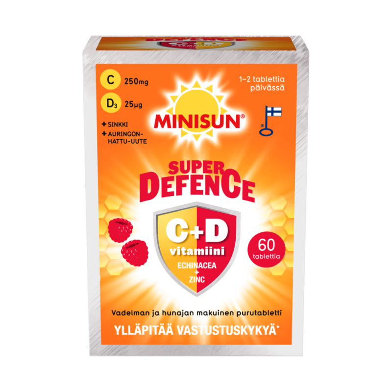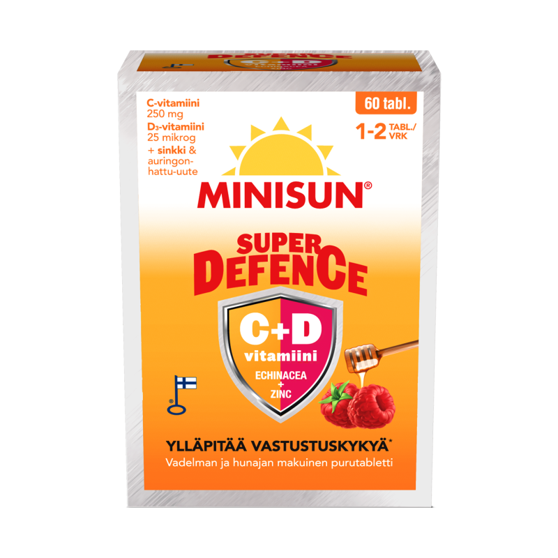 Minisun Super Defence on C- ja D3-vitamiineja sekä sinkkiä ja auringonhattu-uutetta sisältävä valmiste. Minisun Super Defence on oikea superpakkaus vastustuskykyyn. Se sisältää 250 milligrammaa C-vitamiinia ja 25 mikrogrammaa D3-vitamiinia sekä sinkkiä ja auringonhattu-uutetta. Molemmat vitamiinit ylläpitävät tutkitusti vastustuskykyä, ja sinkki sekä auringonhattu-uute edistävät immuunijärjestelmän normaalia toimintaa. Lisäksi C-vitamiinin on todettu vähentävän väsymystä ja uupumusta, ja D-vitamiini on tärkeä luuston rakentaja sekä lihasten toiminnan ylläpitäjä. Minisun Super Defence sopii kuureina käytettäväksi silloin, kun keho tarvitsee erityistä tukea. Vadelman ja hunajan makuinen purutabletti maistuu hyvältä ja sopii erityisesti aikuisille. Vuorokausiannos on yhdestä kahteen purutablettia. Valmiste on gluteeniton, laktoositon, maidoton, soijaton ja liivatteeton.