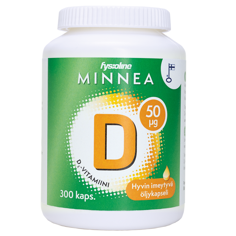 Kotimainen Minnea D3-vitamiini. Se on auringonkukkaöljyä sisältävä öljykapseli, minkä ansiosta D-vitamiini imeytyy hyvin. Kapseli on pienikokoinen ja helposti nieltävä. Gluteeniton, hiivaton, laktoositon, maidoton, sokeriton.