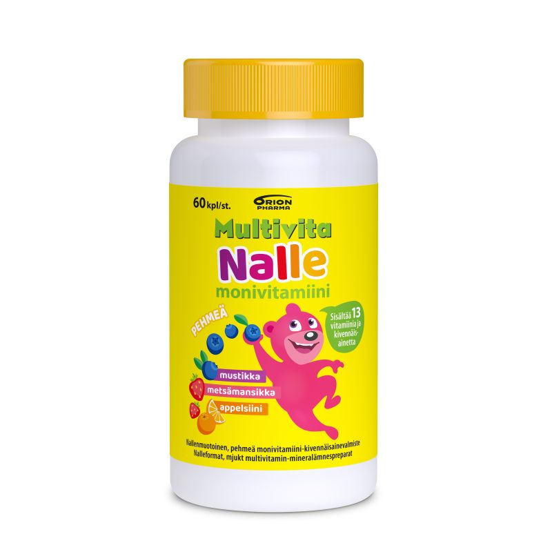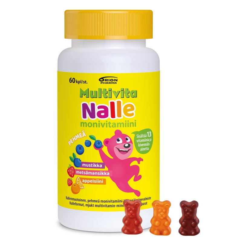 Uusi Multivita Nalle monivitamiini on monipuolinen vitamiinivalmiste hyvän ravitsemuksen tueksi. Sen sisältämät vitamiinit ja kivennäisaineet tukevat lapsen normaalia kasvua ja kehitystä*. Nallen muotoiset valmisteet maistuvat hedelmäiseltä ja marjaiselta - samassa pakkauksessa on metsämansikan, mustikan ja appelsiinin makuisia -ja värisiä nalleja. Yksi Multivita Nalle monivitamiini sisältää jopa 13 eri vitamiinia ja kivennäisainetta, joiden pitoisuudet perustuvat aina uusimpiin suomalaisiin ravitsemussuosituksiin. Maista ja ihastu!