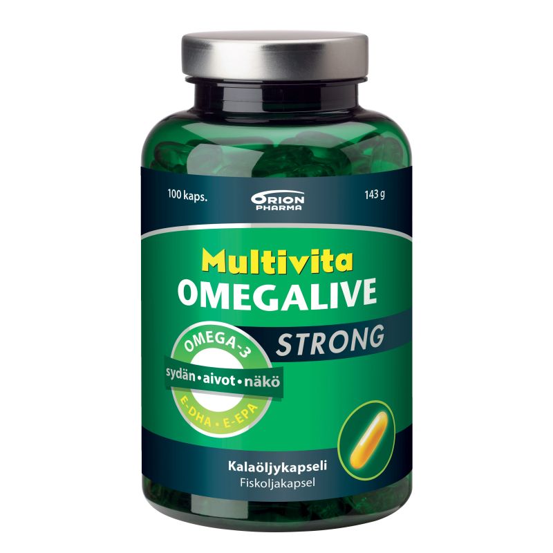 Multivita Omegalive Strongin sisältämät tärkeät omega-3-rasvahapot DHA ja EPA tukevat sydämen normaalia toimintaa ja lisäksi DHA edistää aivojen sekä näkökyvyn normaalina pysymistä. Edullinen vaikutus näkökyvylle ja aivoille saavutetaan nauttimalla päivittäin 250 mg DHA:ta, ja sydämelle nautittaessa 250 mg DHA:ta ja EPA:a. Valmiste ei sisällä lisättyjä vitamiineja ja sopii siksi käytettäväksi yhdessä vitamiinivalmisteiden kanssa.