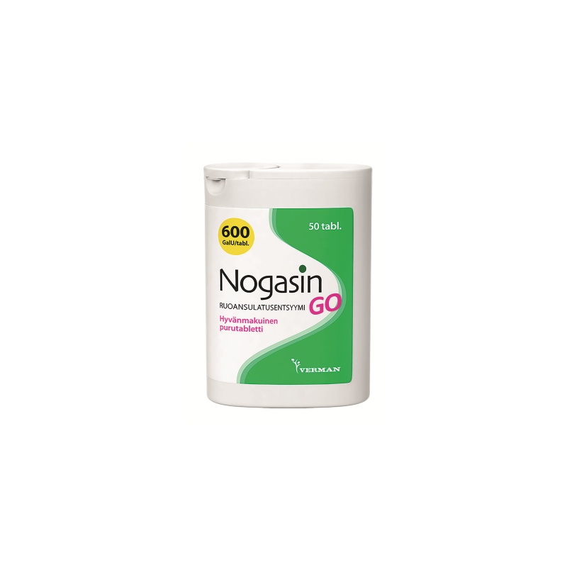 Nogasin on tehokas ja helppokäyttöinen entsyymivalmiste etenkin kasvikunnan tuotteiden kanssa käytettäväksi. Nogasin sisältää luontaista alfagalaktosidaasi–entsyymiä. Se on kätevä ja helppo käyttää niin arkena kuin juhlissakin. Nogasin toimii pilkkomalla ravinnon sulamattomia osia ruuansulatuskanavassa ja siten estää kaasunmuodostusta. Se auttaa pilkkomaan pitkäketjuisia hiilihydraatteja, joita esiintyy kasviksissa, kuten kaaleissa ja pavuissa, kokojyväviljassa ja pähkinöissä. Nogasin toimii jo ennen kuin ikäviä oireita on syntynyt. Siksi se tulee ottaa aterian yhteydessä.
