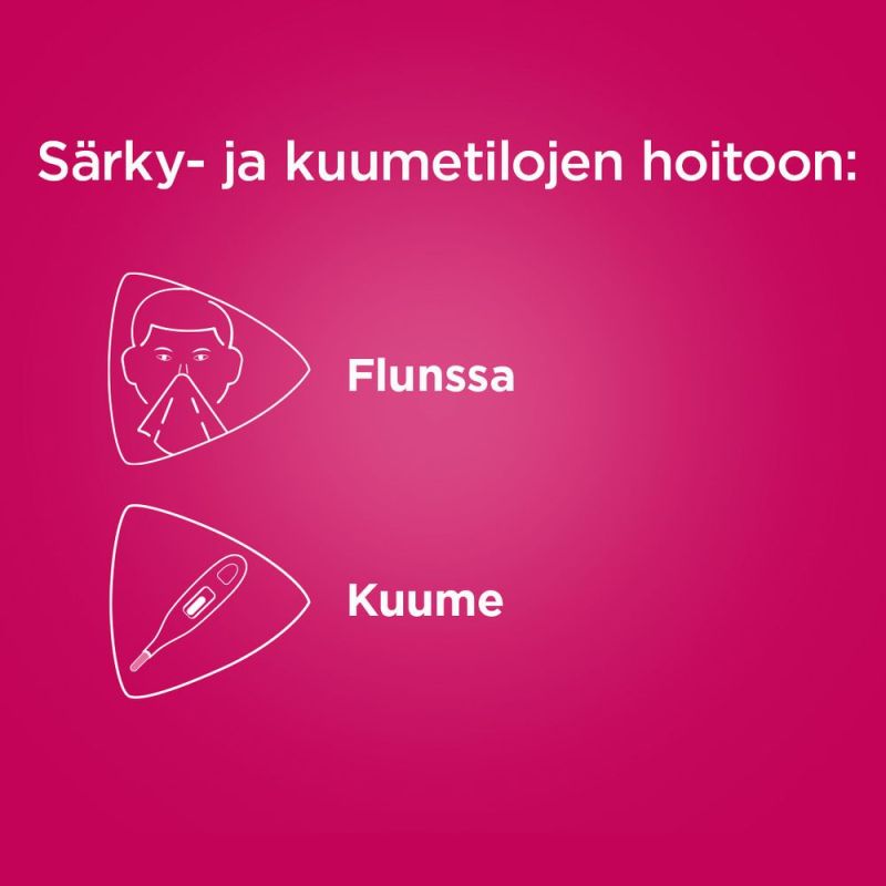 Kuume ja särkytilat vilustumissairauksien yhteydessä, influenssa, päänsärky ja lihassärky.