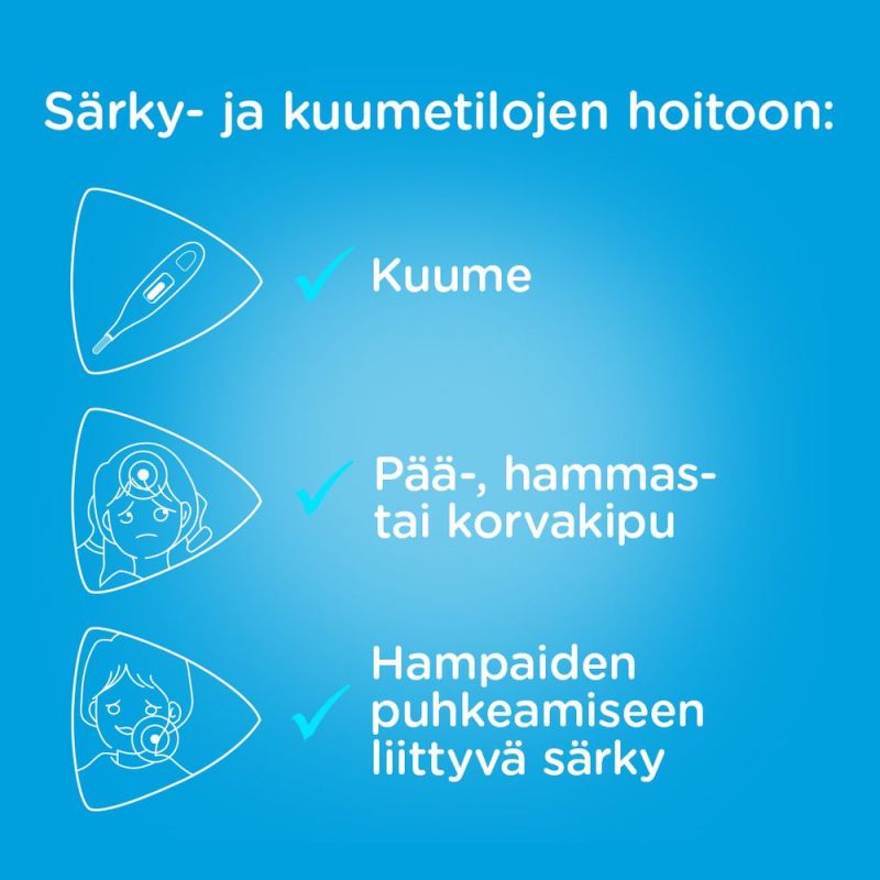 Parasetamolin annos lapsille (yli 3 kk) on 15 mg/painokilo korkeintaan 3 kertaa vuorokaudessa (perustuu suurimpaan vuorokausiannokseen 45 mg/kg). Alle 3 kuukauden ikäisille ja yli kolmen päivän yhtäjaksoiseen käyttöön vain lääkärin määräyksellä