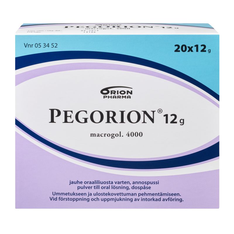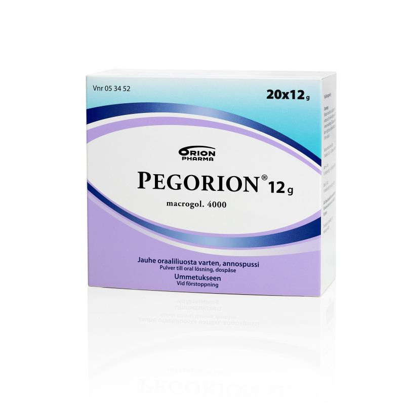 Pegorion 12 g jauhe oraaliliuosta varten on ummetuksen hoitoon sekä kuivuneen, suolessa pitkään olleen ulostemassan (ulostetukkeuma) pehmentämiseen tarkoitettu valmiste. Vaikuttava aine makrogoli 4000 sitoo vettä, jolloin suolen sisällön vesimäärä lisääntyy ja ulostemassa pehmentyy. 12 g annospussit soveltuvat aikuisille ja yli 8-vuotiaille lapsille. Pitkäikaiseen käyttöön lääkärin ohjeen mukaan.