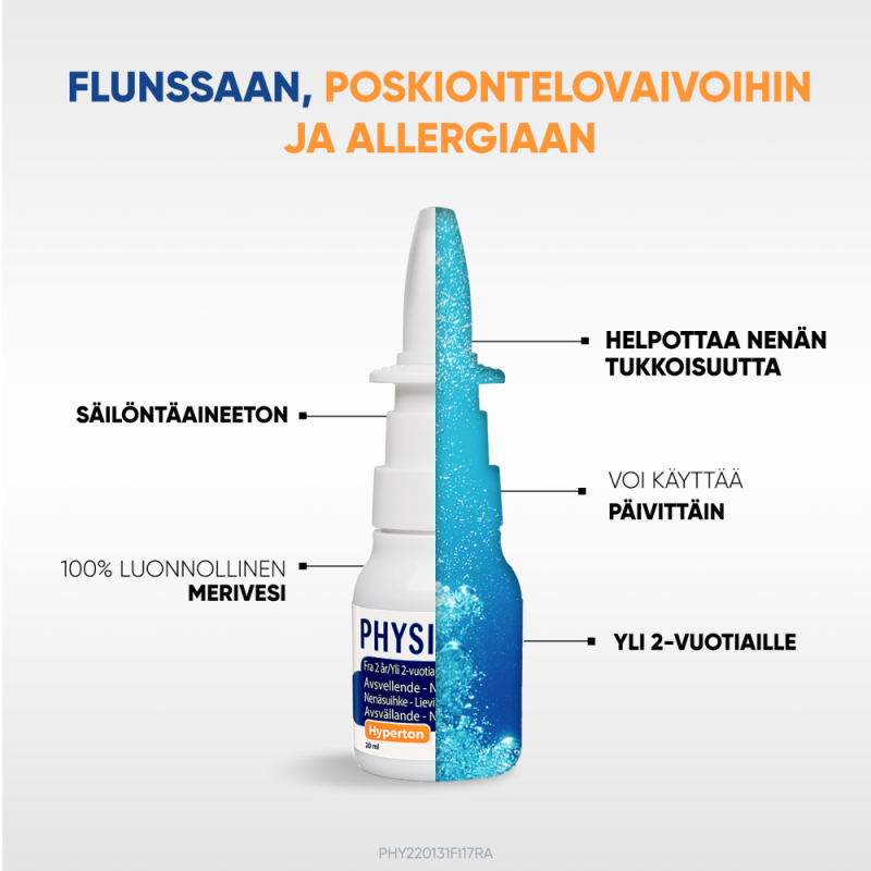 Physiomer Hyperton on luonnollinen nenän limakalvoturvotusta vähentävä nenäsuihke, joka lievittää nenän tukkoisuutta flunssan, poskiontelovaivojen ja allergisen nuhan aikana. Nenäsuihke sisältää 2,2% suolaliuosta ja vaikuttaa osmoottisesti. Omoottinen vaikutus poistaa nestettä turvonneilta limakalvoilta vähentäen limakalvoturvotusta, mikä helpottaa hengittämistä. Physiomer Hyperton on luonnollinen vaihtoehto lääkkeellisille nenäsuihkeille, ja sitä voi käyttää raskauden ja imetyksen aikana. Sopii yli 2-vuotiaille. Physiomer Hyperton nenäsuihke on lääkinnällinen laite. Lue pakkausseloste huolellisesti ennen käyttöä.
