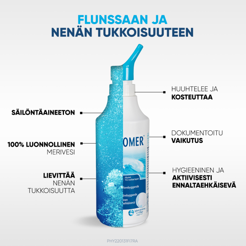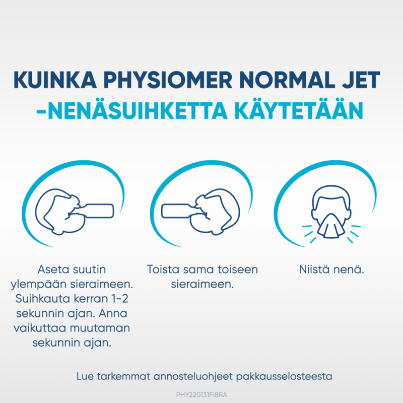 Physiomer Normal Jet on 100% merivettä sisältävä nenähuuhde, joka lievittää vuotavan ja tukkoisen nenän oireita. Päivittäinen huuhtelu voi ennaltaehkäistä riskiä jälkitaudeille korvissa, nenässä ja nielussa. Physiomer Normal Jet sisältää kaksi erilaista suutinta erilaisiin tarpeisiin. Sininen suutin antaa hienojakoisen suihkeen ja valkoinen tarkan suihkeen. Sininen suutin on suunniteltu päivittäiseen ennaltaehkäisyyn hyvän nenähygienian ylläpitämiseen. Valkoinen suutin on suunniteltu flunssan tai muun nenäinfektion aiheuttamaan nuhaan. Säilöntäaineeton. Sopii yli 2-vuotiaille. Physiomer Normal Jet on lääkinnällinen laite. Lue pakkausseloste huolellisesti.