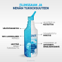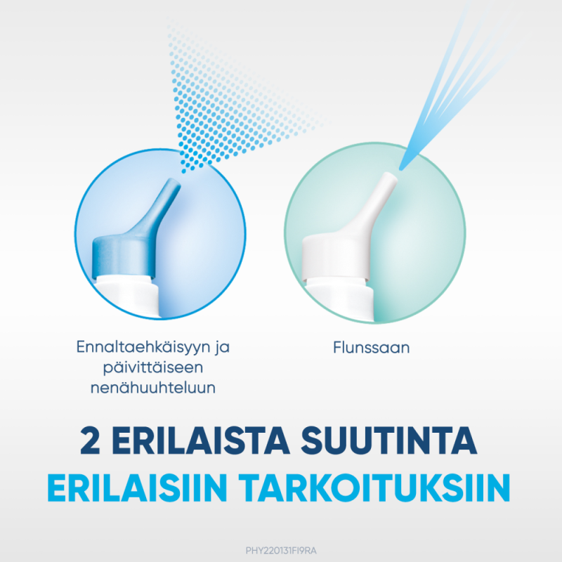 Aikuisille ja yli 2-vuotiaille. Käytä tarpeen mukaan. Käytä valkoista suutinta valuvaan nenään ja sinistä suutinta päivittäin ennaltaehkäisevään käyttöön. Suihkuta 1-2 sekuntia molempiin sieraimiin, anna vaikuttaa muutama sekunti ja niistä varovasti nenä.