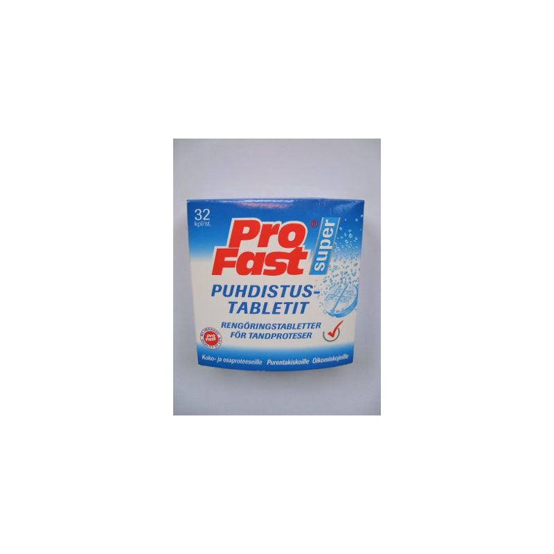 ProFast super puhdistustabletit soveltuvat kokoproteesille, osaproteesille sekä oikomiskojeille. ProFast super puhdistustabletit on kehitetty erityisesti puhdistamaan veteen liukenemattomia ainejäämiä proteeseista ja oikomiskojeista. Antibakteerinen koosmutus eliminoi bakteerit, jotka aiheuttavat pahaa hajua ja plakkia.