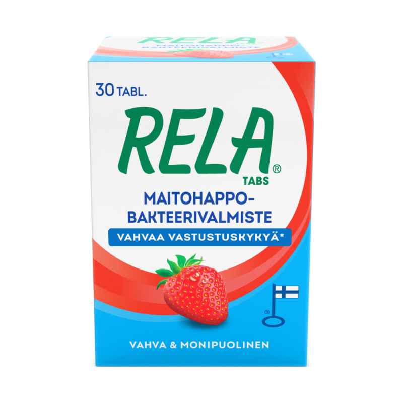 Uudistuneet Rela-maitohappobakteerivalmisteet sisältävät kahta tutkittua ja korkealaatuista bakteerikantaa (Lactobacillus rhamnosus SP1 ja Bifidobacterium lactis BLC1) ja 3 miljardia bakteeria päiväannosta kohden. Vahvaa vastustuskykyä** – Rela Tabs -tuotteet sisältävät maitohappobakteerien lisäksi C-vitamiinia, joka on tärkeä vastustuskyvyn ylläpitäjä. Hyvänmakuinen Rela Tabs Mansikka maistuu raikkaalle mansikalle, ei sisällä sukraloosia ja sopii koko perheelle. Uudistuneet Rela-tuotteet on valmistettu Suomessa ja niillä on avainlippumerkki.
