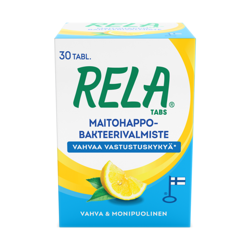 Uudistuneet Rela-maitohappobakteerivalmisteet sisältävät kahta tutkittua ja korkealaatuista bakteerikantaa (Lactobacillus rhamnosus SP1 ja Bifidobacterium lactis BLC1) ja 3 miljardia bakteeria päiväannosta kohden. Vahvaa vastustuskykyä** – Rela Tabs -tuotteet sisältävät maitohappobakteerien lisäksi C-vitamiinia, joka on tärkeä vastustuskyvyn ylläpitäjä. Hyvänmakuinen Rela Tabs Sitruuna maistuu lempeälle sitruunalle, ei sisällä sukraloosia ja sopii koko perheelle. Uudistuneet Rela-tuotteet on valmistettu Suomessa ja niillä on avainlippumerkki.