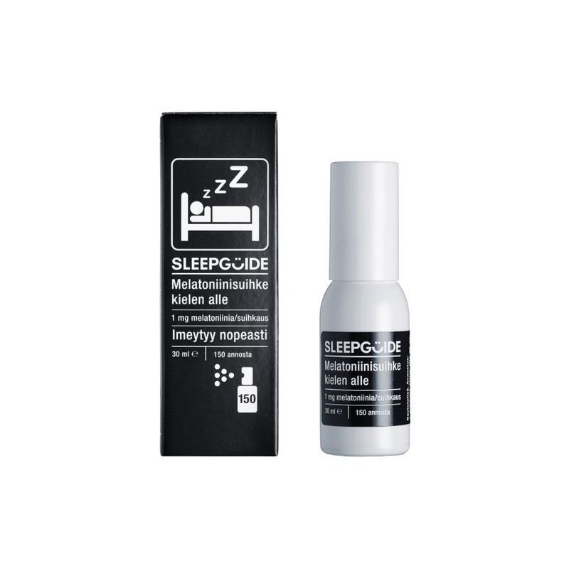 Sleepguide Melatoniinisuihke sisältää melatoniinia, joka vaikuttaa nukahtamis- ja heräämisrytmiin ja helpottaa jetlagoireita.