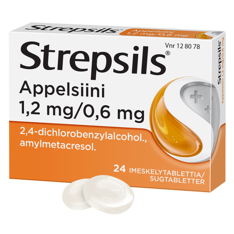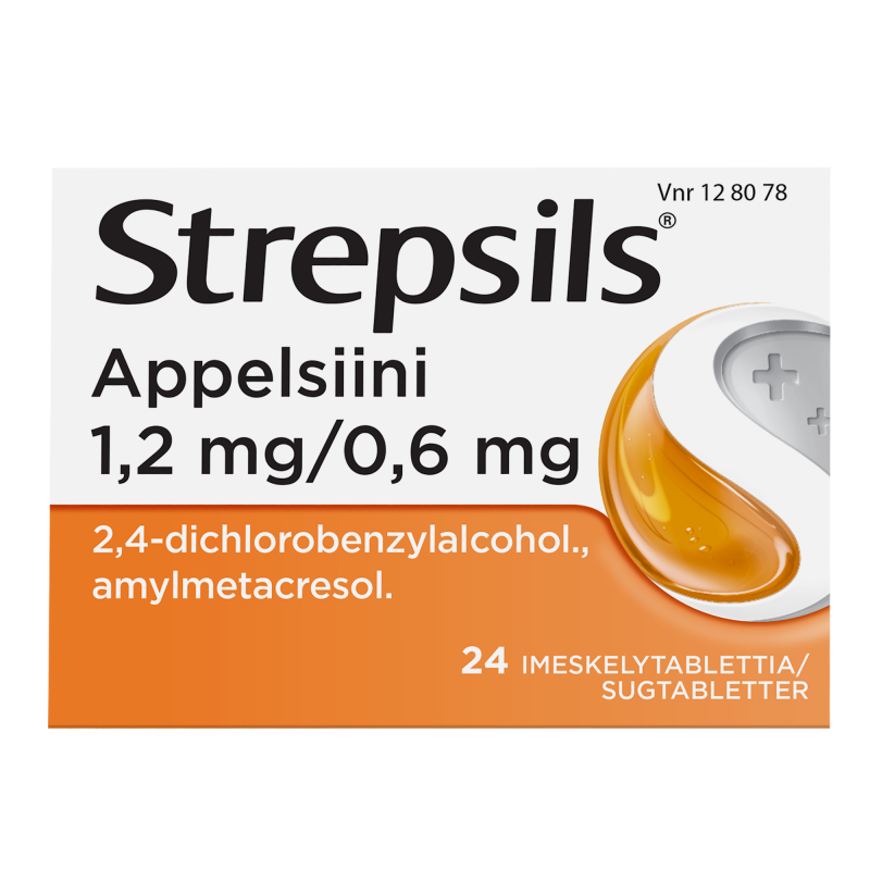 Strepsils Appelsiini on antiseptinen imeskelytabletti, joka lievittää suu- ja nielutulehdusten oireita. Se vähentää nielun arkuutta, lievittää kipua ja helpottaa nielemisvaikeuksia. Strepsilsin vaikuttavat aineet (2,4-diklooribentsyylialkoholi ja amyylimetakresoli) ovat antiseptisiä aineita, joilla on bakteereja, sieniä ja viruksia tuhoavia sekä niiden lisääntymistä estäviä ominaisuuksia.
