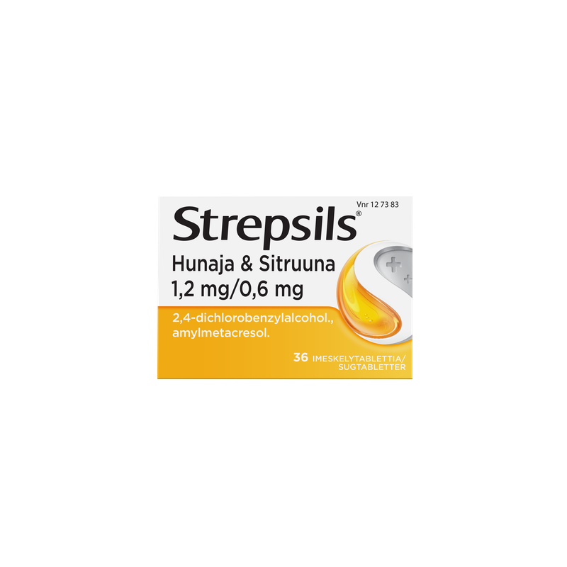 Strepsils Hunaja & Sitruuna on antiseptinen imeskelytabletti, joka lievittää suu- ja nielutulehdusten oireita.