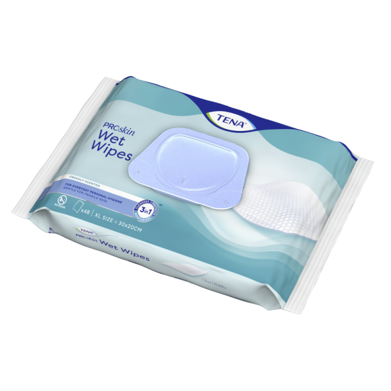TENA ProSkin Kosteat pyyhkeet ovat valmiiksi kostutettuja pyyhkeitä aikuisille, jotka puhdistavat, kosteuttavat ja suojaavat herkintäkin ihoa. Tämä suurikokoinen kosteuspyyhe on ihanteellinen päivittäisessä käytössä intiimialueen puhdistamiseen inkontinenssituotteen vaihdon yhteydessä tai koko kehon puhdistamiseen. TENA ProSkin kosteuspyyhe on hellävarainen vaihtoehto vedelle ja saippualle ja auttaa pitämään ihon raikkaana, puhtaana ja hajuttomana. Lisäksi kätevän muovikannen ansiosta pyyhkeen ottaminen onnistuu yhdellä kädellä.